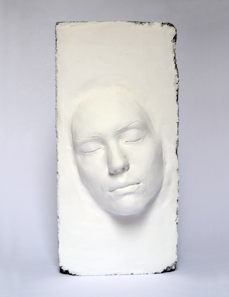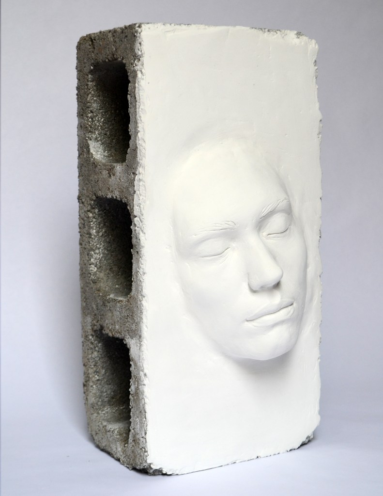 Escultura de yeso sobre block de concreto.